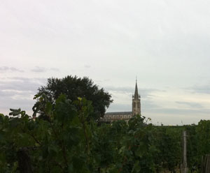 The Church of Pomerol seen through the vines at Eglise Clinet