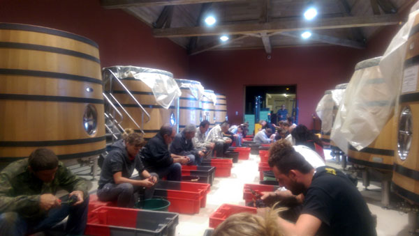 When we returned the Domaine had been turned into a production line where each picker would sit and cut the bunches “baie par baie” (berry by berry), selecting only the berries that are pristine. Each berry would be cut individually and the stalks left behind. Because the grapes are only treated by hand and never dropped, pumped, or run through a machine, the skins all remain perfectly intact. This painstakingly slow and precise process will hopefully yield the best wine possible from the Clos. The quantity will be tiny, and it isn’t certain whether this extra step will yet yield a new wine for the market, or merely elevate the already brilliant Clos de Vougeot to another level. If it is a success, there is also a slight possibility this could be converted to the entire production of Grands Echezeaux. However, it will take a team of more than 50 to take that on, as even with 35 people today the timing was tight to finish in time. One bunch of grapes can take up to 5 minutes to cut and sort.