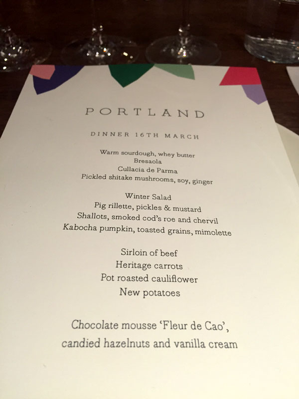 As luck would have it, the line-up consisted of at least one wine from each of the major communes and, for good measure, there was even a Côtes de Bourg red and a white from a very famous château included. The food for the evening was already taken care of thanks to Portland’s private dining menu so, as soon as we had all arrived, we got cracking on the white while we waited for the first course of mixed starters to arrive.
